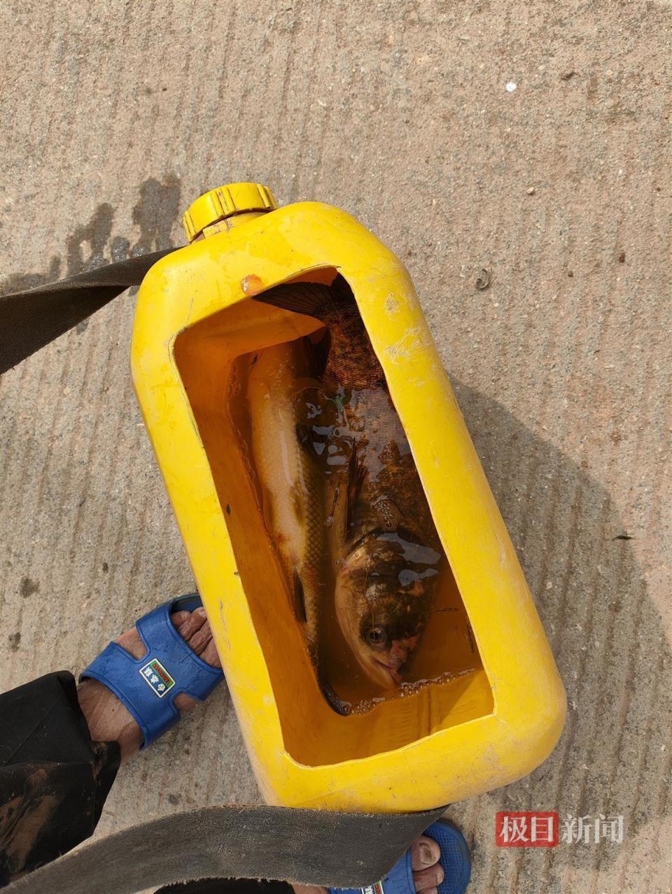 灵水村附近一片被淹的地里,尚未完全退去的积水还有约30厘米深。几位村民在田里捕鱼,没多长时间,一位村民就捕到一条草鱼和一条鲢鱼。一位捕鱼的村民告诉记者,水库的水淹没农田时,很多水库的鱼儿跑到田里,这几天他在田里和河道里打到几百斤大鱼。