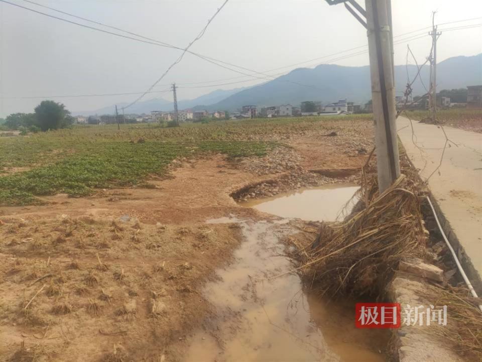 6月22日下午,极目新闻记者在东石镇锡水村看到,村里一条乡道经过一条河流处的桥梁已经被冲断,无法通行。河道内一片狼藉,堆积了很多树枝和杂物。村民李先生告诉记者,6月16日中午,村子附近的两座水库发生满溢,洪水流进了村子,淹没了数百亩农田。他家的房子也被水围住,村干部后来用叉车将他和其他村民转移出去。