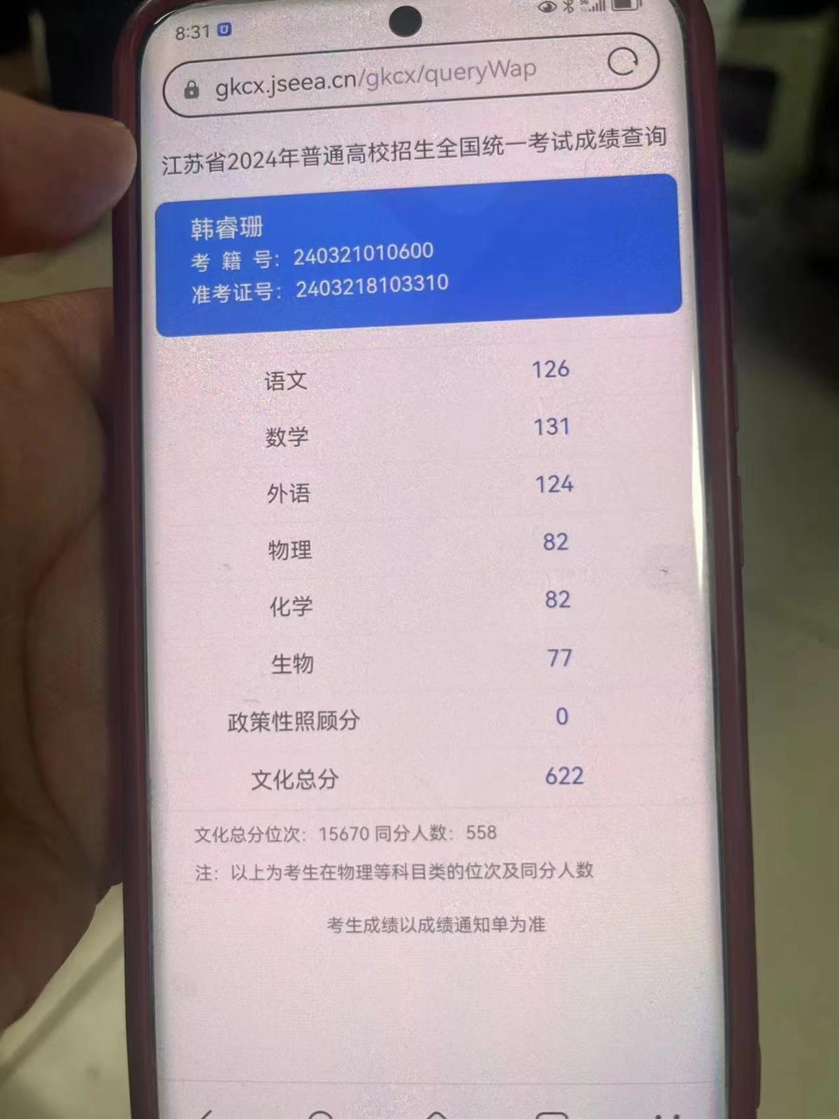 极目新闻记者获取的韩睿珊高考成绩截图显示,她的高考总分为物理类622分。据公开资料,江苏省2024年物理类本科分数线为462分,韩睿珊的成绩超本科线160分。韩思雨告诉极目新闻记者,6月28日江苏开始填报高考志愿了,家人将先为妹妹填报她此前心仪的南京医科大学,她的分数是够的。