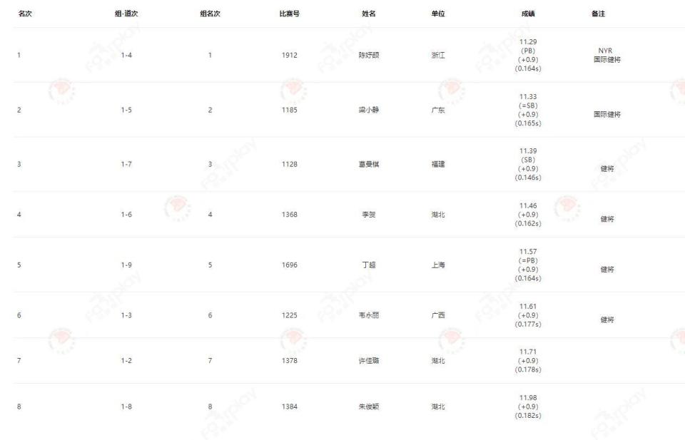 进入最后20米,陈妤颉发力实现了对梁小静的超越,11秒29陈妤颉率先冲过终点,这一成绩刷新了PB。梁小静第2个冲过终点,葛曼棋第3名完成比赛。