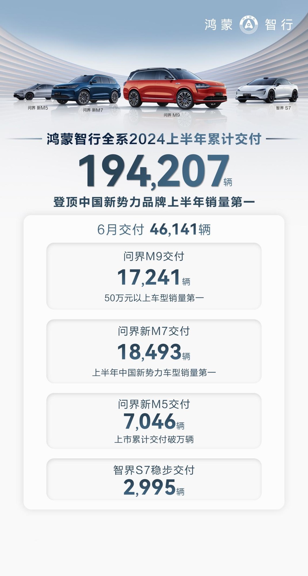 凭借强大的技术实力、卓越的产品表现以及完善的体系力,鸿蒙智行6月交付46141辆,2024年累计交付194207辆,登顶中国新势力品牌上半年销量冠军。其中,豪华科技旗舰SUV问界M9,6月交付17241辆,累计大定超10万辆;国民SUV问界新M7,6月交付18493辆,稳居2024年上半年中国新势力车型第一;高颜都市性能SUV问界新M56月交付新车7046辆,累计交付超1万辆;鸿蒙智行首款智慧轿车智界S7,6月交付新车2995辆。