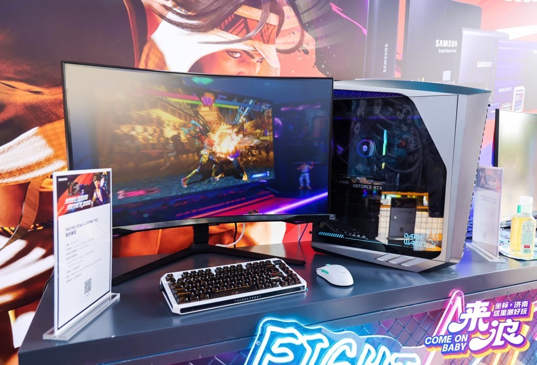在众多参展品牌中,三星存储凭借强大的性能和品牌感召力脱颖而出,还有美丽的《街霸》“Coser”小姐姐助阵。充满赛博朋克味道的展台内设置《街霸》+《CS》和《极限竞速》三个游戏体验区,国内知名的电脑品牌雷神携手三星存储,为游戏体验区带来超给力的主机和装备,为小伙伴们带来难忘的体验。