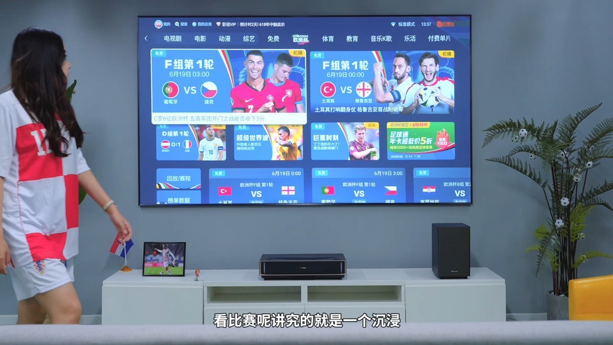 欧洲杯是声化的赛场,绿茵场上,足球声、奔跑声和呐喊声此起彼伏,而在比赛之外,星光S1 Pro亦可摇身一变化身家庭影院。激光电视在观感上天然具有影院巨幕的感觉,海信激光电视星光S1 Pro 100英寸更采用电影院同源技术,以顶级画质表现和定制级音响相辅相成,造就影院般的观影体验。