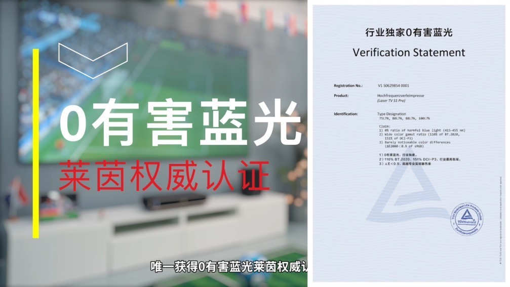 说到护眼就不得不提防有害蓝光,作为行业独家0有害蓝光莱茵权威认证的电视,评测中展示了海信激光电视星光S1 Pro的RGB纯净激光光源,有别于传统电视背光源LED,更窄的光谱能从光源处规避有害蓝光415-455nm波段,真正达到从根源处护眼。
