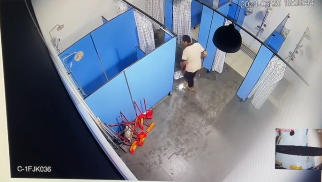 公共视频显示,沐浴间内有四个隔间,每个隔间门口有一个白色的门帘,有工作人员在里面打扫卫生。多张图片显示,摄像头安装在亲子沐浴间内的天花板上,正对着淋浴区。