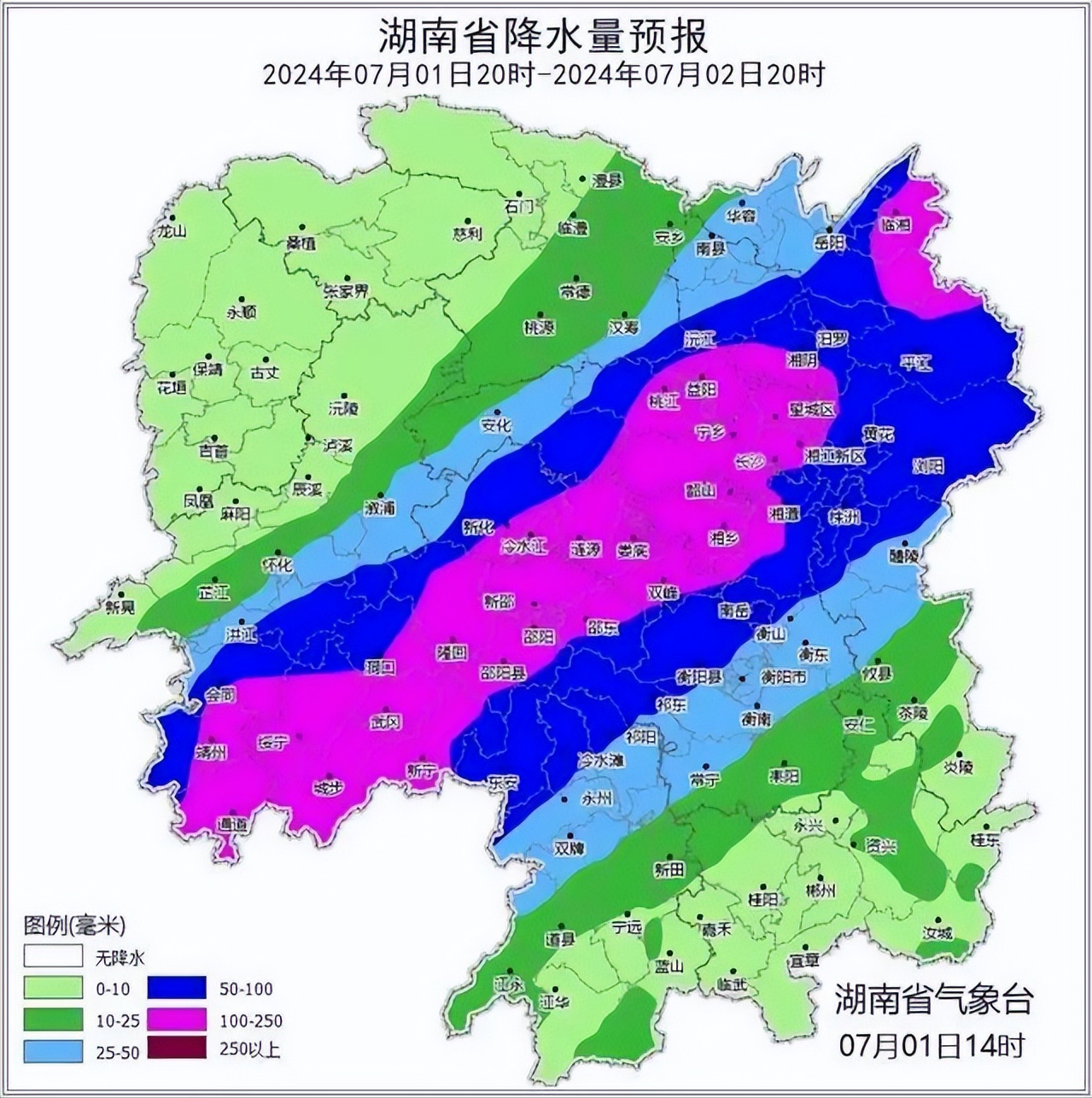 同时,根据地质灾害成灾规律和相应条件,结合短期气象预报情况,湖南省相关部门经过会商,发出自7月1日20:00至2日20:00该时段,在湘东北、湘中、湘西南部分区域发生突发性地质灾害的橙色预警信息。