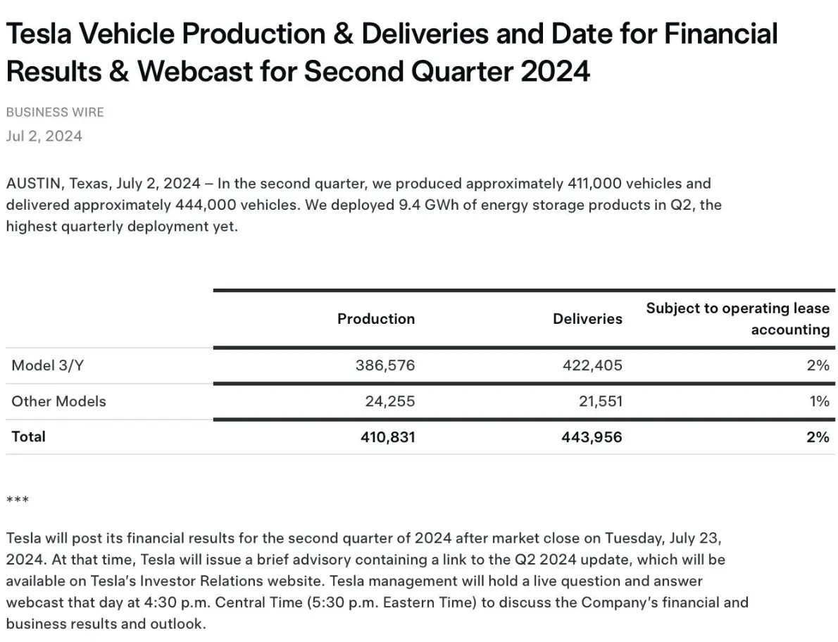 对比此前数据,虽然同比下降,但本季度的交付数据明显好于第一季度,高于分析师的预期。具体来看,在2024年第一季度,特斯拉生产了43.3万辆新车,交付了38.7万辆;在2023年第二季度,特斯拉生产了47.9万辆新车,交付了46.6万辆。
