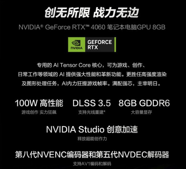 幻16 Air使用了100W的NVIDIA GeForce RTX 4060,并且支持DLSS 3.5光线重建技术。专用的AI Tensor Core核心可以为游戏、创作和日常工作等领域提供强大的AI性能和革新功能,为专业创作、深度学习、日常办公提供绝佳动力。