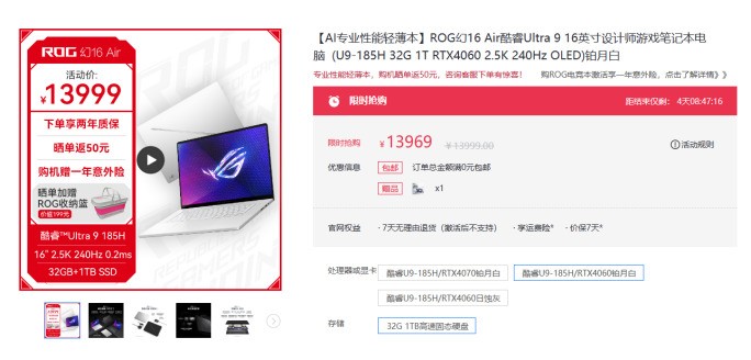 第一款要推荐的是ROG幻16 Air,从品牌来看,ROG品牌在电脑行业中名列前茅,而从产品轻薄程度和特性上看,这款产品属于专业性能下的轻薄型产品,并且为整个产业树立了该领域的标杆。主要原因在于它的处理器搭载新一代Intel酷睿Ultra 9 185H,显卡采用NVIDIA GeForce RTX 4060的版本,配置组合十分强劲。目前,该款笔记本的售价为13969元,下单享两年官方质保、赠一年意外险,还送ROG收纳篮,福利多多。
