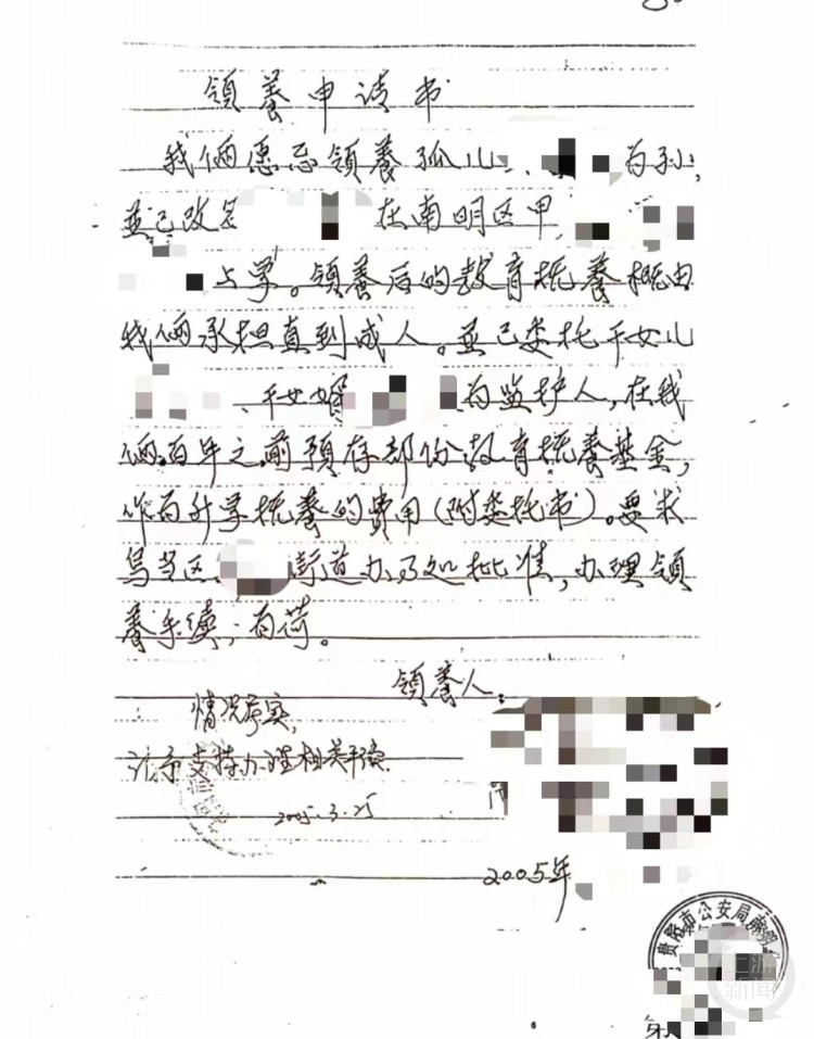 李某夫妇为领养李甲手写的领养申请书。图片来源/受访者供图