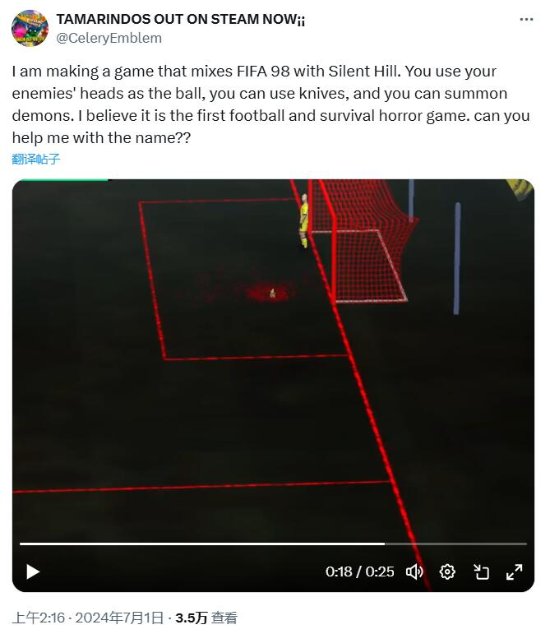 一名独立开发者Celery Emblem在社交媒体上展示了一段游戏演示视频,表明他正在打造一款结合了《FIFA 98》和《寂静岭》元素的足球类游戏。