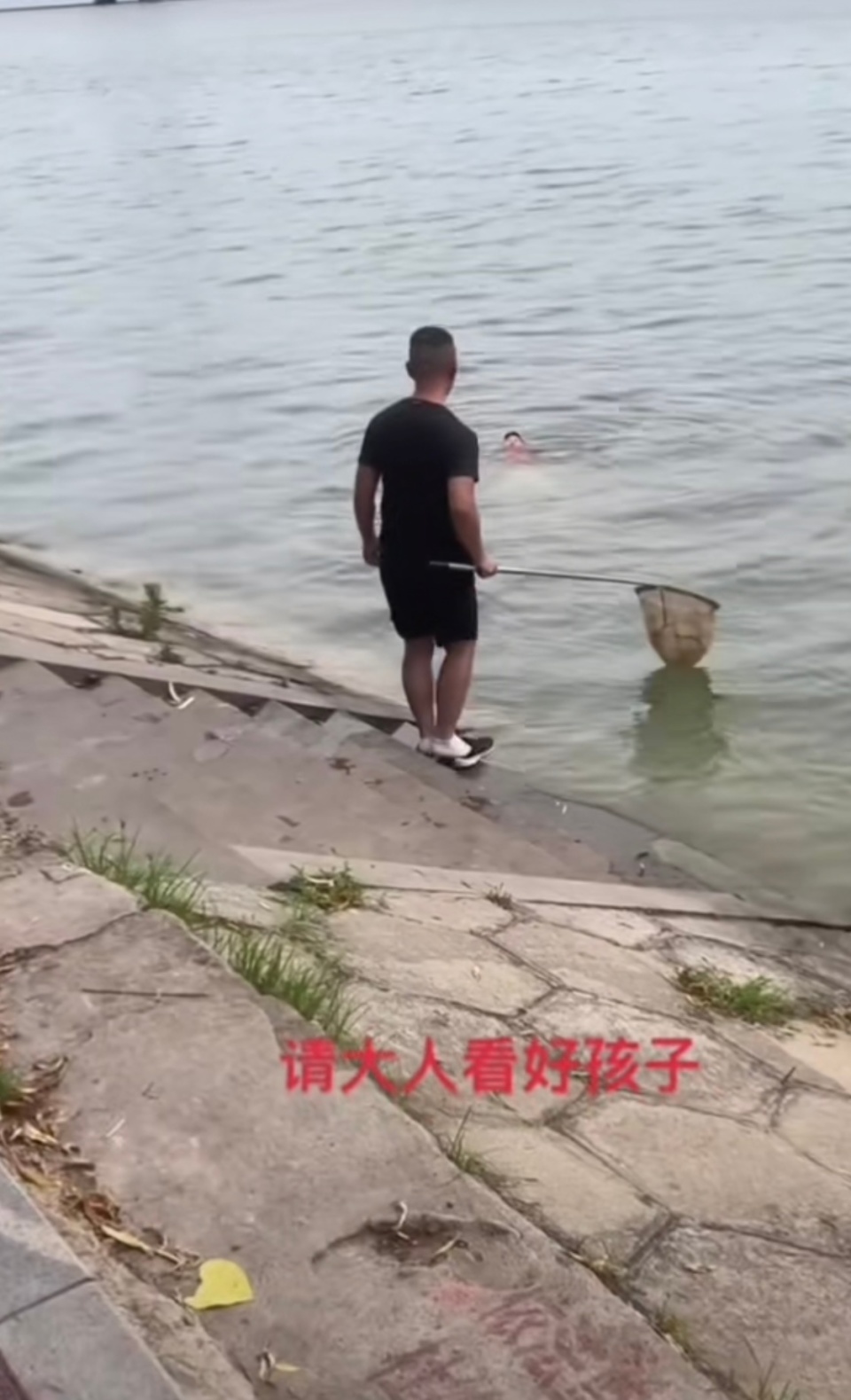 袁先生尝试通过捕鱼杆将孩子救起。 图/受访者社交平台