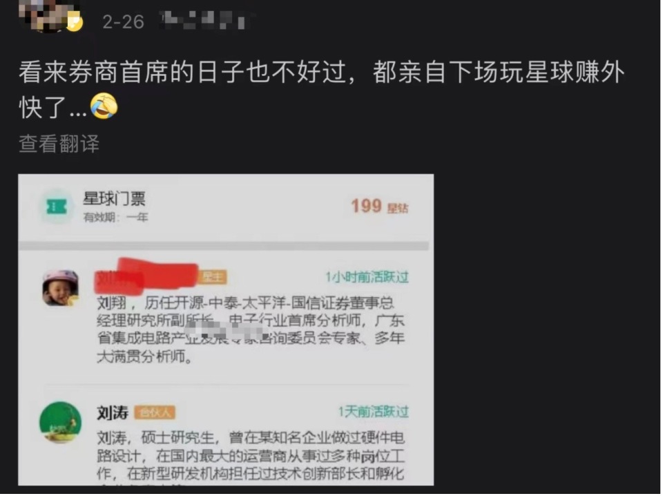 早在今年2月26日,刘翔就被网友发现开通了付费的知识星球。入场券199元,有效期一年,“2024/2/27至2025/2/27”彼时他还未从开源证券离职。被调侃“看来券商首席日子也不好过,都亲自下场玩星球赚外快了”。