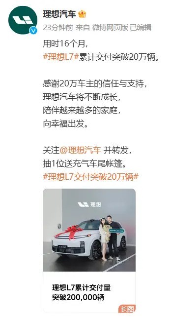 理想汽车今日宣布,其旗舰车型L7的累计交付量已经突破20万辆,仅用时16个月。据了解,L7于2023年2月8日上市,同年3月11日开启交付,并于2023年11月7日达到了10万辆的交付量。按照交付时间计算,L7的月均交付量约为1.25万辆。