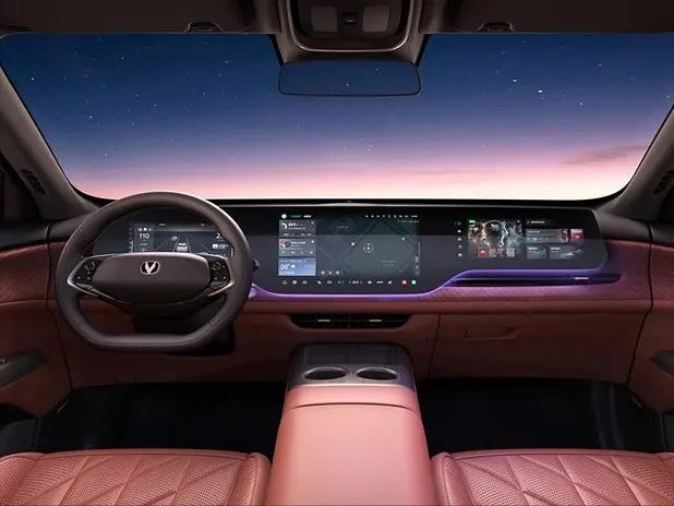 从设计图中可以看出,新车的内饰采用了三块大联屏设计,其中中控屏的尺寸尤其引人注目。此外,在三联屏下方还配备了氛围灯带,提升了车内的氛围感。同时,新车还配备了怀挡设计,为驾驶者提供了更便利的操作方式。