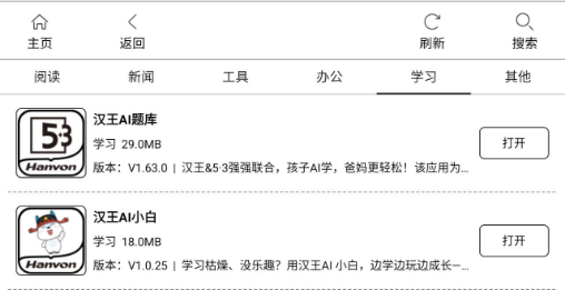 汉王今日发布了电纸本学习类应用,该应用适用于N10 / mini / touch 2024电纸本。此次上新包括AI题库(53题库)和AI小白(大模型系列应用)。用户可以通过应用市场中的学习模块进行下载。
