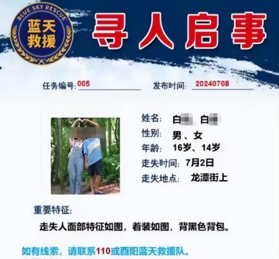 据媒体报道,重庆酉阳县西酬镇溪口村的16岁男孩白某因玩手机被妈妈说了几句,后带着14岁妹妹离家出走。7月2日上午,家属报警。救援队组织人员表示,5日凌晨5点,用手机定位到白某兄妹二人在龙潭街上附近。