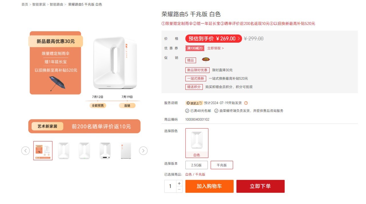 荣耀路由5千兆版售价299元,2.5G版售价369元,官网和京东商城正在进行全款预售活动,购买千兆版直降30元,到手价269元,2.5G版直降20元,到手价349元,还赠送限量定制雨伞,7月19日正式上市!