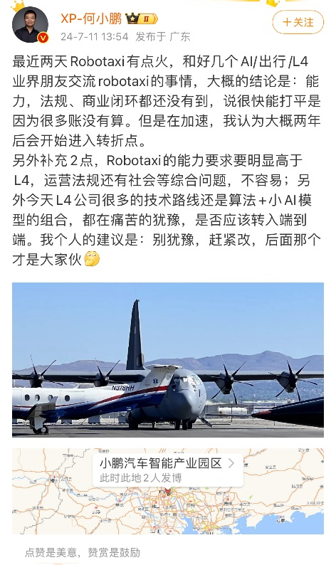 7月11日,何小鹏在微博上对Robotaxi的技术路径发表观点称:“今天L4公司很多的技术路线还是算法+小AI模型的组合,都在痛苦的犹豫,是否应该转入端到端。我个人的建议是:别犹豫,赶紧改,后面那个才是大家伙。”