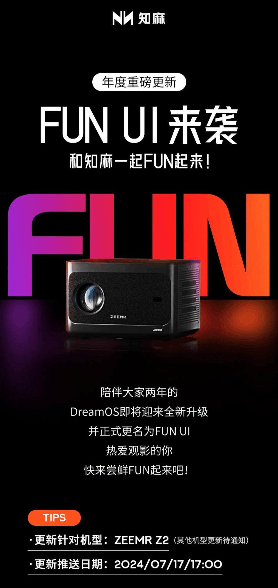 知麻正式推出了ZEEMR Z2投影仪的年度更新,DreamOS系统也升级成了FUN UI。新系统内置了电视直播接口,并新增了儿童模式功能。此外,用户在升级新系统后,将会获得6个月的金卡会员资格,可以观看专区内的影片内容。