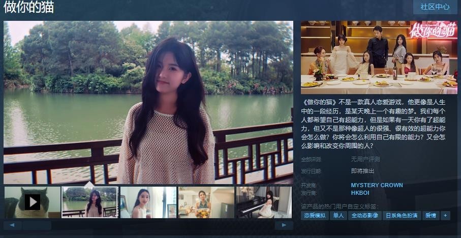 7月18日,真人互动恋爱游戏《做你的猫》在Steam上架销售,支持简繁体中文,并预计将于未来发售。游戏旨在带给玩家全新的体验。玩家将以第一人称视角,运用自己获得的超能力来改变和影响周围的人物角色,其中包括几位年轻、风格迥异的美女角色。