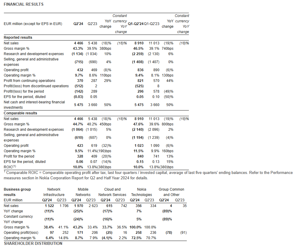 在财务方面,诺基亚的第二季度调整后每股收益为0.06欧元,预计将达到0.05欧元。此外,在第二季度末时,该公司拥有自由现金流为4亿欧元,并且净现金余额为55亿欧元。