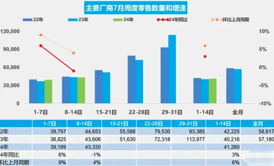 具体到周数据中,在七月份第一周的日均零售量为3.9万辆,同比增长6%,环比增长9%。第二周的日均零售量上升至4.3万辆,虽然同比微降了1%,但环比仍增长了4%。