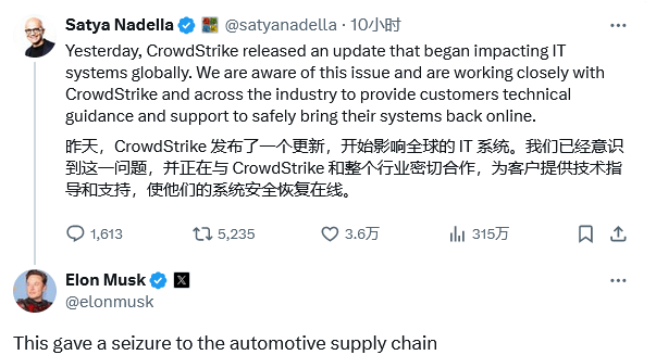 微软首席执行官萨蒂亚·纳德拉(Satya Nadella)昨天(7月19日)在X平台发布推文,表示微软已经与CrowdStrike密切合作,并为客户提供技术指导和支持,以尽快安全地恢复其系统。纳德拉写道:“CrowdStrike昨日发布的更新,影响了全球的IT系统。我们已经意识到这个问题,目前已经和CrowdStrike、整个行业密切合作,为客户提供技术指导和支持,以安全地恢复其系统。”