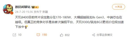 根据数码闲聊站的最新爆料,联发科的天玑8400芯片在安兔兔跑分测试中取得了令人瞩目的成绩,其得分范围大约在170万至180万之间。这一成绩超越了高通骁龙8s Gen3(约在170万分左右)。虽然联发科中端芯片展现了越级挑战的能力,但真正具有竞争实力的对手是自家次旗舰平台。