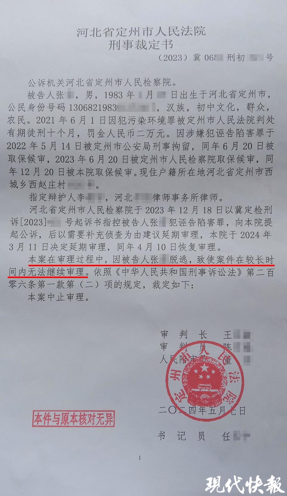 案件审理过程中,处于取保候审的张某逃跑了。2024年5月7日,定州市人民法院出具的一份《刑事裁定书》中显示,因被告人脱逃,致使案件在较长时间内无法继续审理。依照《中华人民共和国刑事诉讼法》第二百零六条第一款第(二)项的规定,裁定本案中止审理。值得一提的是,该《刑事裁定书》中还提到,张某除了此次涉嫌犯诬告陷害罪一案,早在2021年6月1日,曾因犯污染环境罪被定州市人民法院判处有期徒刑十个月,罚金人民币二万元。