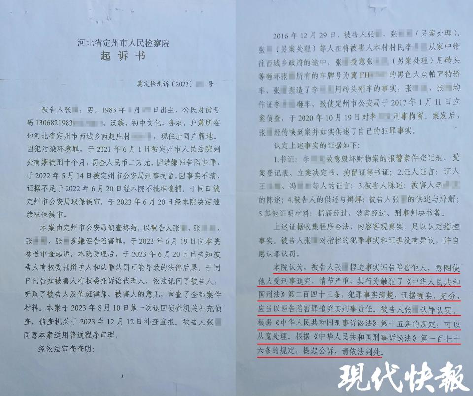 据了解,在李先生被解除取保候审半个月后,张某因涉嫌诬告陷害罪,于2022年5月14日,被定州市公安局刑事拘留,同年6月20日被取保候审。定州市公安局侦查终结后,将张某及案发时在场的另外三人,以涉嫌诬告陷害罪,一同移送至检察机关,进行审查起诉。李先生向现代快报记者提供了一份《起诉书》,落款单位是定州市人民检察院,时间是2023年12月14日。