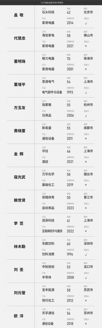 值得注意的是,今年的榜单中有15位连续入围者,相比去年增加了5位。其中,比亚迪的王传福与汇川技术的朱兴明成为今年榜单中仅有的两位连续四年入选的CEO。