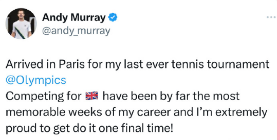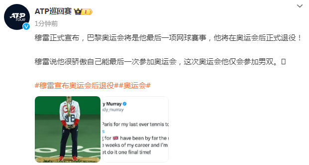 穆雷通过社媒宣布写道:“来到巴黎参加我人生中最后一次网球比赛,奥林匹克竞争一直是激烈的,为英国队出战是我职业生涯中最值得纪念的几周,我非常高兴能最后再参加一次比赛。”