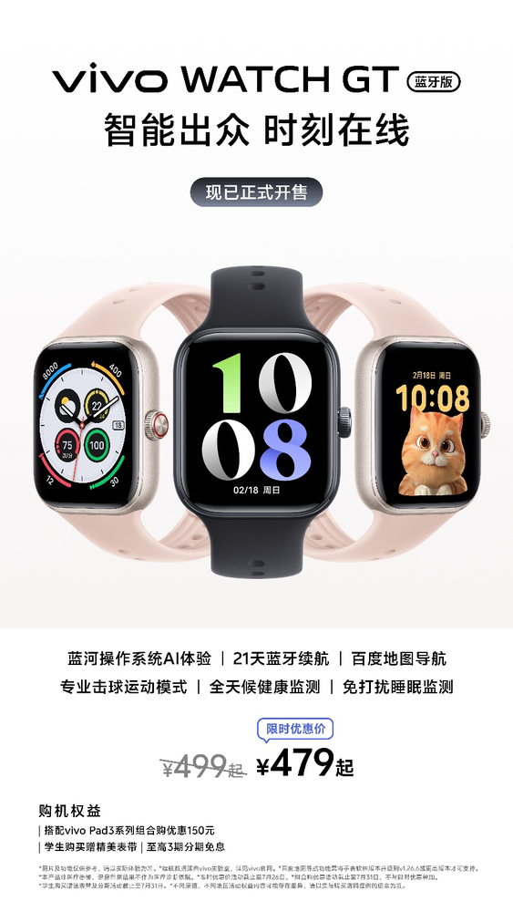 购买vivo WATCH GT蓝牙版可以享受3期免息优惠。学生购买更可加赠精美表带;7月24日至26日期间购表还有限时优惠20元,到手价479元起;同时搭配vivo Pad3系列组合购优惠150元。想要以超值价格获得一款“腕上智能好搭档”的朋友不容错过!