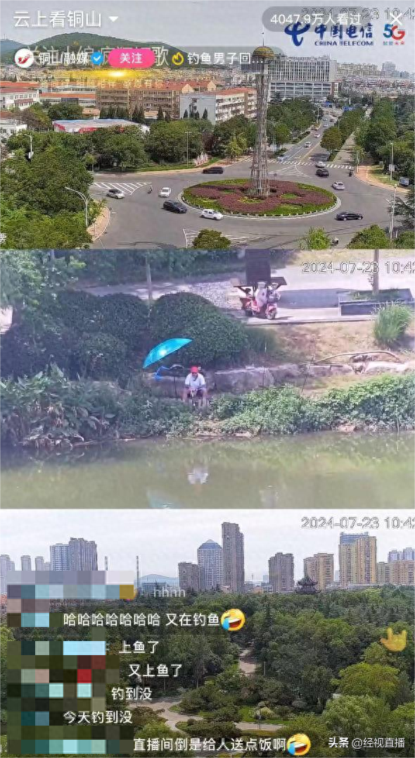 7月23日,经视直播记者进入抖音号名为“铜山融媒”的媒体直播间,直播间累计观看人数已达到4047万人。直播间分为三个屏幕,内容分别为城市交通、城市风景以及钓鱼者画面。网友在弹幕上的讨论也非常精彩,“这里真的有鱼吗”、“放首苦咖啡DJ”、“大家都是来看钓鱼的吗”、“他们知道自己被直播吗”。媒体编辑也会不停切换直播画面和合适的音乐,与直播间的网友互动。