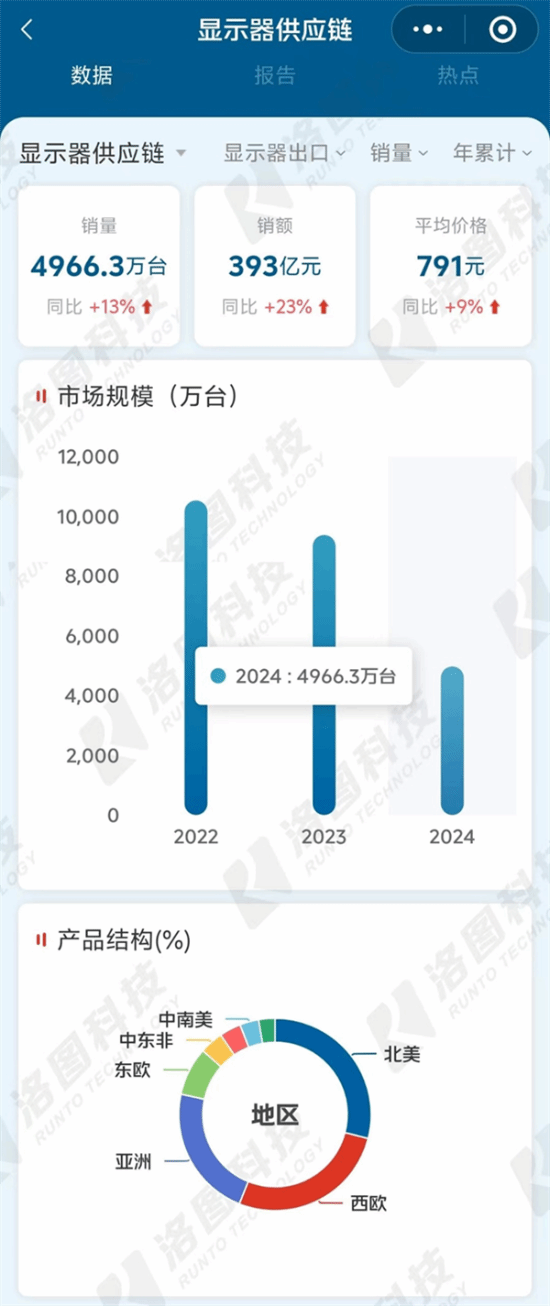 根据洛图科技(RUNTO)最新统计数据,2024年上半年,中国大陆的通用显示器出口总量达到4966万台,相较于去年同期增长了13%;出口总额达到393亿元人民币,同比增长23%。