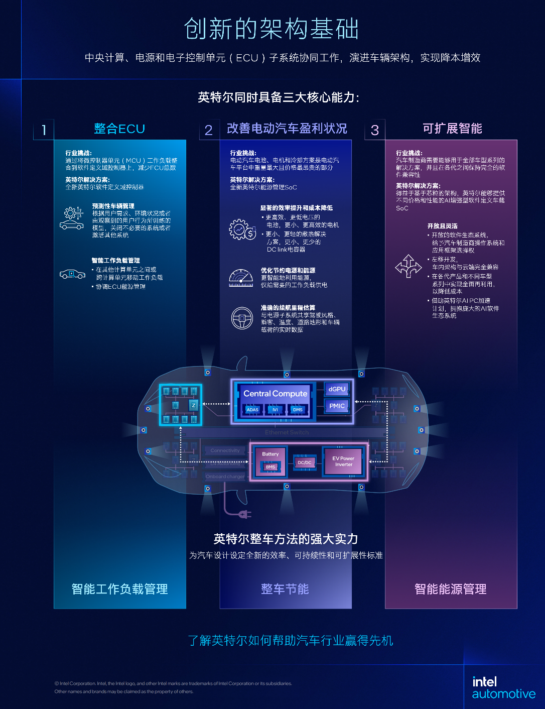 区别于只着眼于构建更好的单个组件,英特尔将各个点连接起来,从而让整个系统受益。英特尔专注于三大核心要素的集成:软件定义车载计算、智能能源管理和类数据中心的工作负载管理。这些先进方案的结合带来了倍增效应,效果远远优于试图对车辆每个方面的成本进行优化的方法。