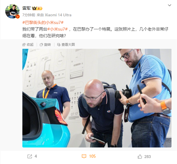 雷军分享了一张照片,显示几位外国友人正在专注于研究小米SU7,并使用相机和手机进行拍摄。雷军对此感到好奇,问道:“他们在研究什么?” 评论区的网友们纷纷回应说:“SU7已经很有名了。”还有人说:“他们被车子的外观吸引了。” 雷军则用一个酷酷的表情包回应。