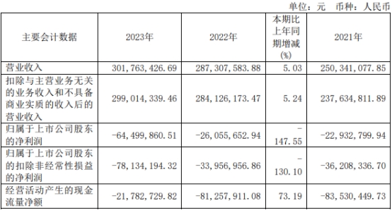 2021年、2022年、2023年,纵横股份的营业收入分别为2.50亿元、2.87亿元、3.02亿元;归属于上市公司股东的净利润分别为-2293.28万元、-2605.57万元、-6449.99万元;归属于上市公司股东的扣除非经常性损益的净利润分别为-3620.83万元、-3395.70万元、-7813.42万元;经营活动产生的现金流量净额分别为-8353.04万元、-8125.79万元、-2178.27万元。