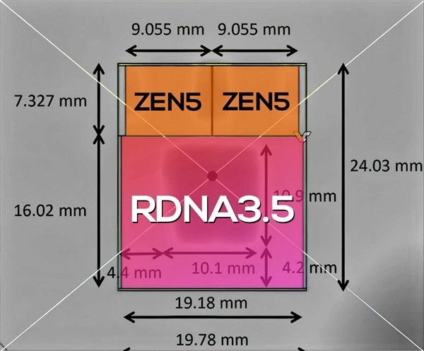 Strix Halo采用了chiplet小芯片设计,CPU部分由两颗八核心的CCD组成,总面积为132.69平方毫米。而GPU部分面积更是达到了307.26平方毫米,是两颗CCD总面积的1.3倍。这款APU拥有16个Zen5 CPU核心和40个RDNA3.5 CU单元的GPU,性能表现令人期待。