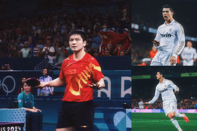 上一轮对阵张本智和,由于法国观众是中立的,所以樊振东选择了拥抱的庆祝动作。这一轮他是绝对客场,所以赢球后选择了更霸气的动作。两个动作都是为了致敬他的主队皇马球员。拥抱的庆祝动作是复制贝林厄姆的经典动作,至于示意法国球迷安静的动作,是皇马传奇C罗的经典庆祝动作。