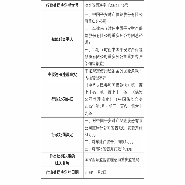 国家金融监督管理总局重庆监管局依据《中华人民共和国保险法》第一百七十条、第一百七十一条;《保险公司管理规定》(中国保监会令2015年第3号)第五十五条、第六十九条决定:一、对中国平安财产保险股份有限公司重庆分公司警告1次、罚款共计51万元二、对车建伟警告并罚款1万元三、对韦将警告并罚款10万元。