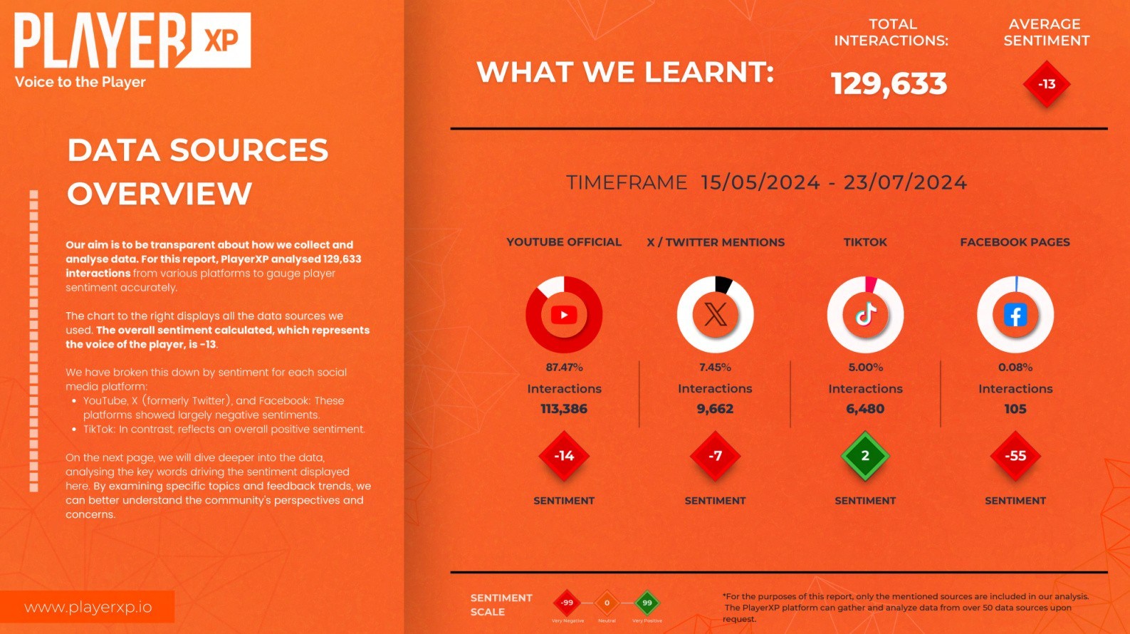 外媒数据分析网站PlayerXP近日发布了一份《刺客信条:影》玩家社区的情绪报告,这份报告涵盖了来自推特、YouTube、Facebook等平台共129633名玩家,分数区间在-99至99分之间。最终玩家的评分为-13分,属于负面评价。