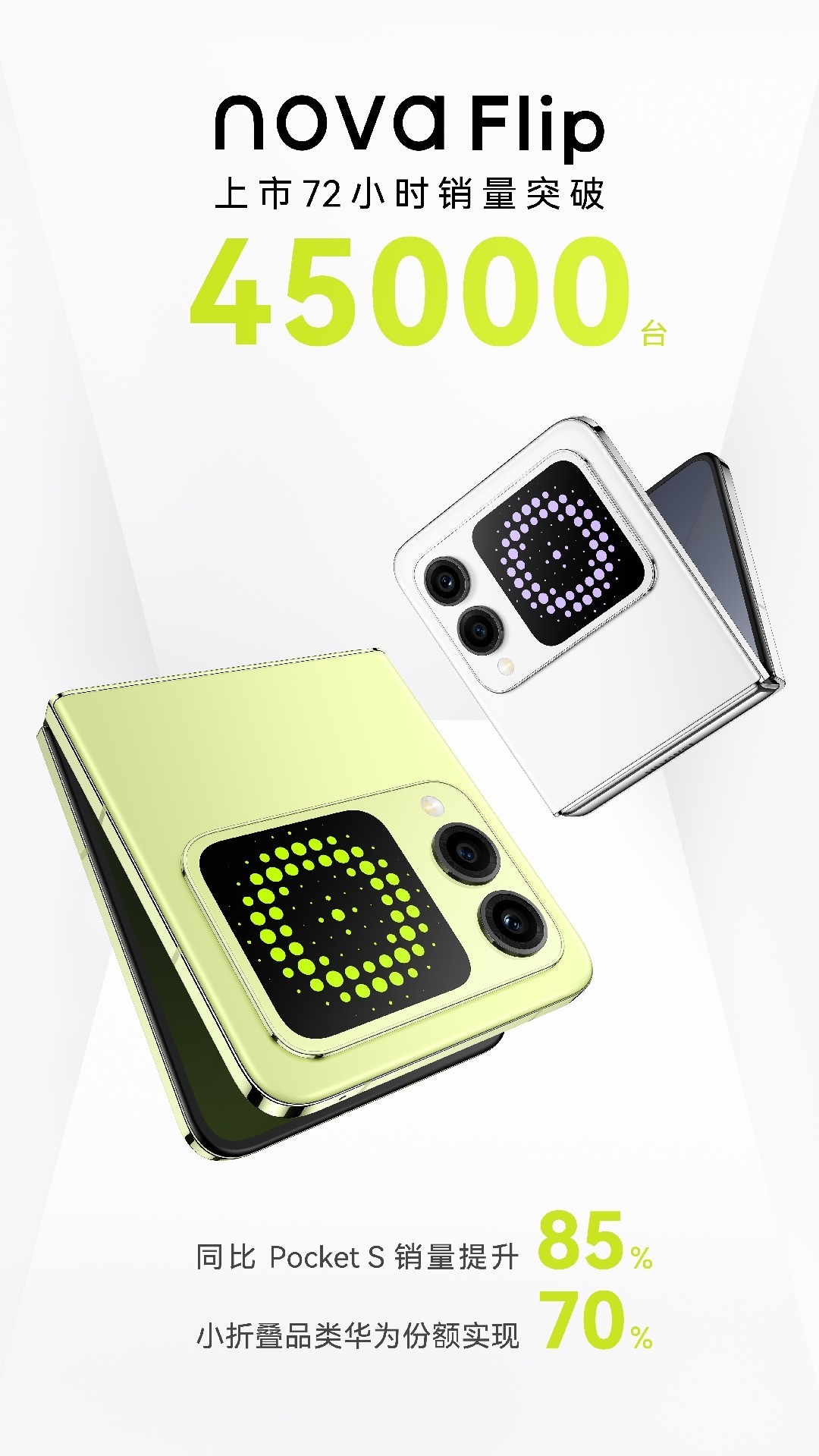 华为nova系列首款小折叠手机——nova Flip已于8月9日正式开售,起售价为5288元。据华为官方宣布,novaFlip上市72小时销量已突破4.5万台,同比Pocket S销量提升85%,助力华为在小折叠品类市场份额突破70%。