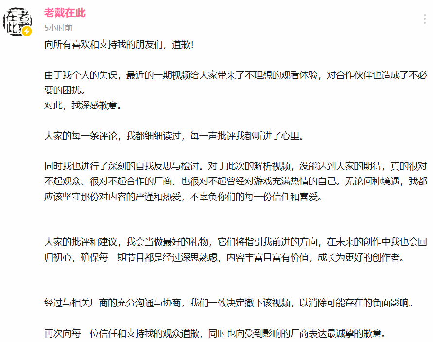之前,一位名叫老戴的UP主发布了一期关于《黑神话》的分析视频,但内容被观众批评为粗糙且不得要领,因为他在视频中连游戏角色的名字都说不清楚,并夹杂了与合作伙伴的商业广告。这种敷衍的态度引发了玩家强烈的不满。两天前他发表了首次道歉声明,今日再次致歉。玩家们表示问题根源在于视频质量不过关,这次只是导火索,关键看以后的表现。“冰冻三尺非一日之寒”,他们强调持续改进的重要性。