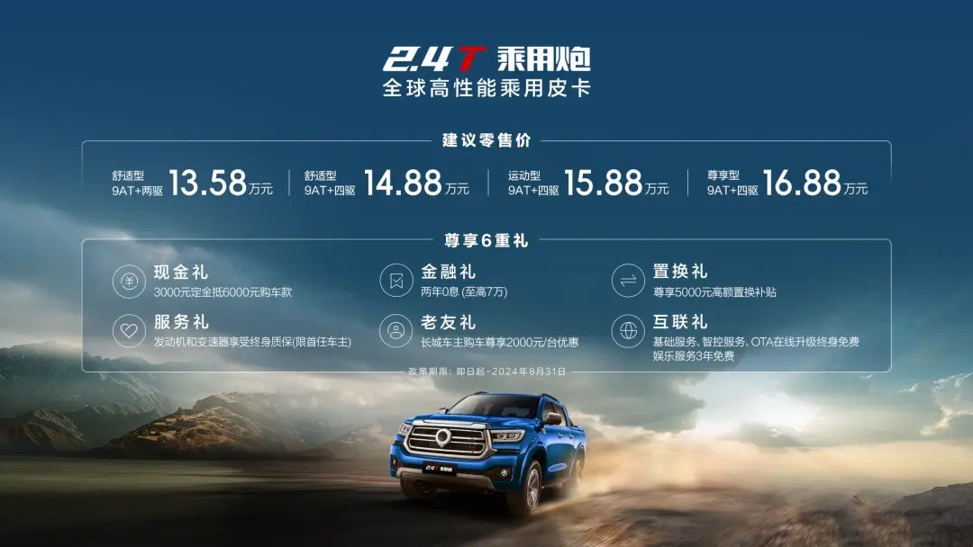 长城炮2.4T乘用炮四款新增车型已上市,售价区间为13.58-16.88万元。这些新车包括舒适型两驱、舒适型四驱、运动型四驱一以及尊享型四驱。其中,最吸引人的地方是搭载了2.4T柴油发动机和9AT变速箱的组合,能够提供最大功率135kW和峰值扭矩480N·m。此外,新车还具备L2+级全域智能辅助驾驶能力和自动泊车功能。