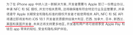 据悉,从即将发布的iOS 18.1版本开始,开发者就可以利用这一组件了。然而,首批支持的仅限于澳大利亚、巴西、加拿大、日本、新西兰、英国和美国的开发者。虽然欧盟地区一直积极推动iPhone开放NFC功能,但苹果在公告中并没有提及何时会在该地区推出此功能。