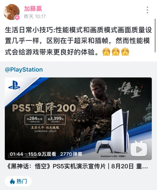 近日,《黑神话:悟空》PS5版实机视频正式公布,展示了其卓越的性能和画质。游戏科学团队成员@加藤赢 在社交媒体上分享了这一消息,并提供了一个有趣的技巧:性能模式和画质模式在画面质量上几乎没有差别,主要区别在于超采样和插帧,而选择性能模式可以带来更顺畅的游戏体验。