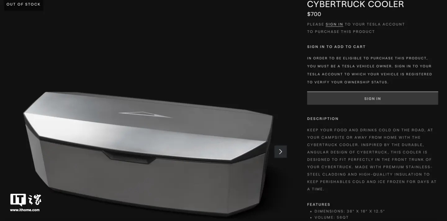 8月18日消息,特斯拉近日在美国官网为其Cybertruck赛博皮卡推出了一款车载冰桶“Cybertruck Cooler”,售价为700美元(约合人民币5017元),目前已售罄。