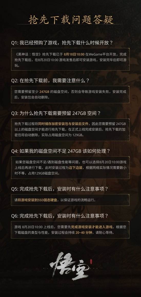 同时,Wegame官方也发布了一份Q&A文档,解答了玩家关于预载问题的疑问。他们提醒玩家,在进行预先下载时需要预留至少247GB的磁盘空间。如果磁盘空间不足或遇到其他磁盘性能等问题,也可以选择在游戏上线后再进行下载。此时,只需占用129G的磁盘空间。
